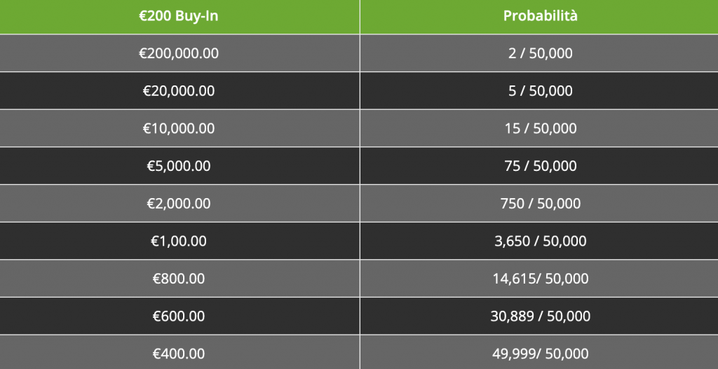 5. Il Concessionario creerà una gruppo di 50.000 tornei Twister Poker “Sit ‘N’ G”’ e distribuirà i premi come da allegato qui sotto. Un nuovo gruppo verrà creato non appena quello precedente è stato completato .